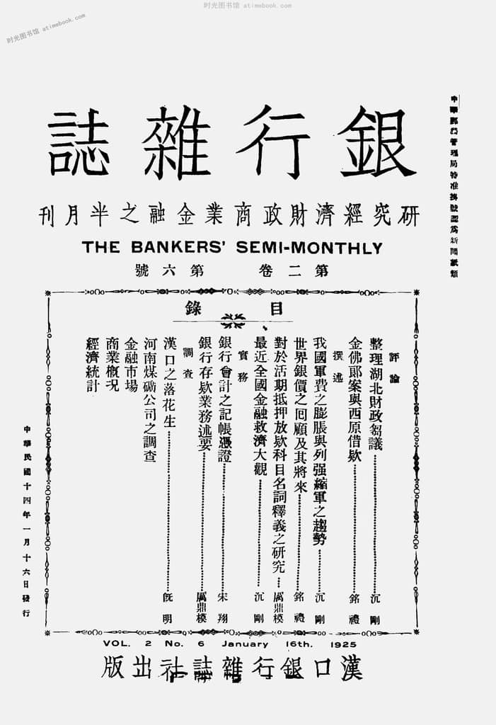 网盘路径:/时光图书馆珍藏系列/书籍文件/老杂志、老期刊/民国期刊/湖北/《银行杂志》(汉口)1925-1925年合集.db