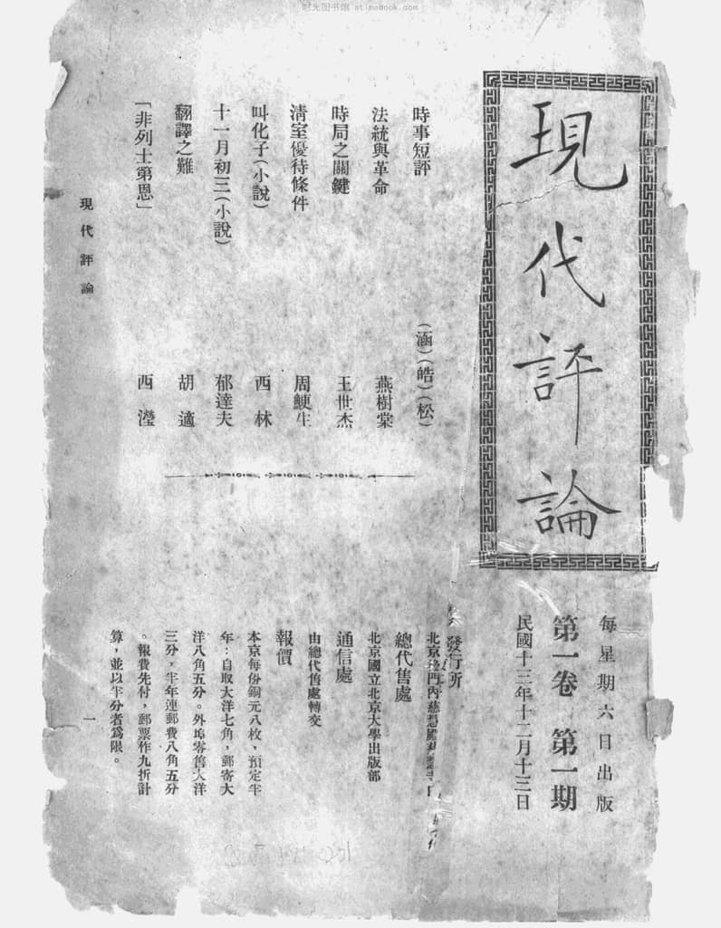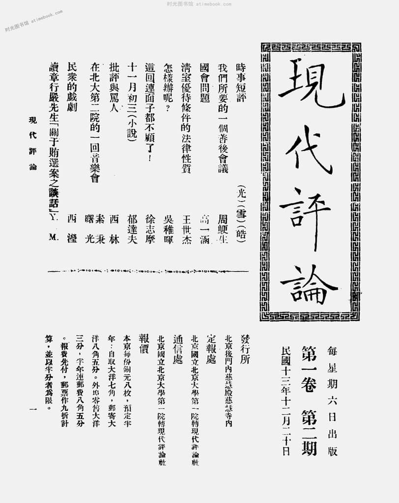 | 网盘路径:/时光图书馆珍藏系列/书籍文件/老杂志、老期刊/民国期刊/上海/《现代评论》(上海)1924-1927年合集.db | ||