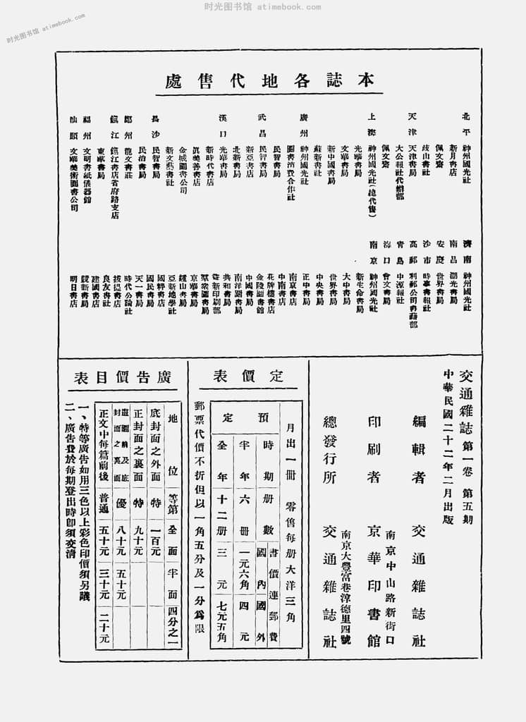 | 网盘路径:/时光图书馆珍藏系列/书籍文件/老杂志、老期刊/《交通杂志》1933-1934年合集.db | ||