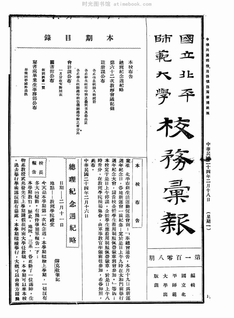 | 网盘路径:/时光图书馆珍藏系列/书籍文件/老报纸/北京/《国立北平师范大学校务汇报》(北平)1935-1937年合集.db | ||