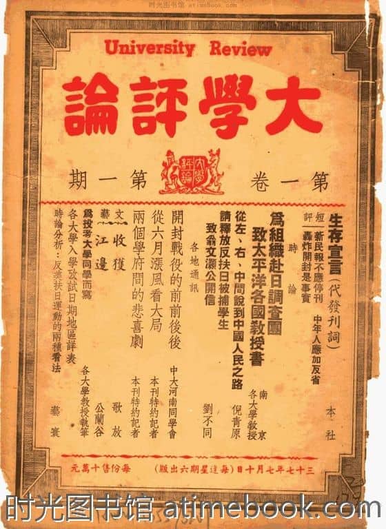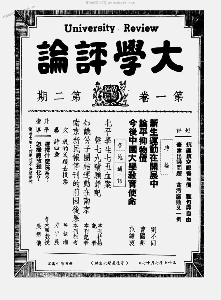 | 网盘路径:/时光图书馆珍藏系列/书籍文件/老杂志、老期刊/民国期刊/南京/《大学评论》(南京)1948-1949年合集.db | ||