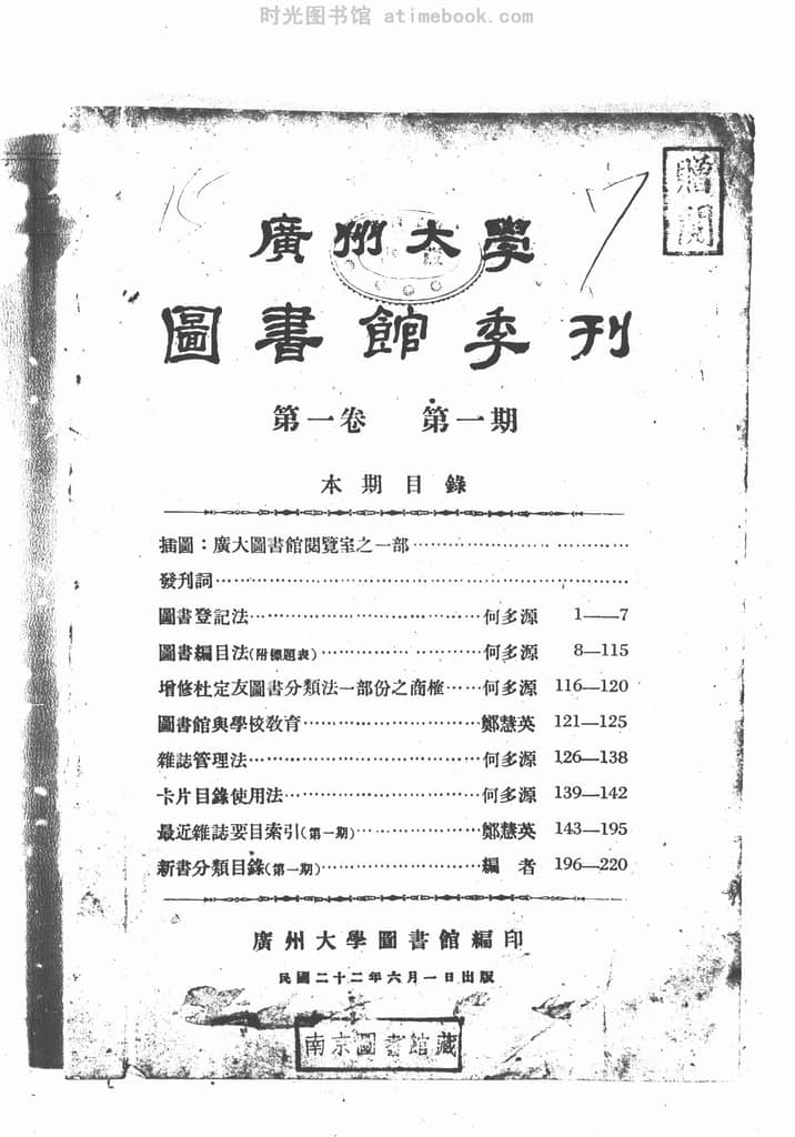 网盘路径:/时光图书馆珍藏系列/书籍文件/老杂志、老期刊/民国期刊/广东/《广州大学图书馆季刊》(广州)1933-1937年合集.db