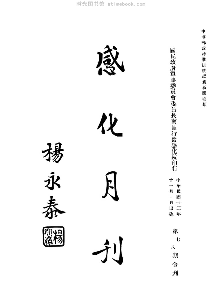 | 网盘路径:/时光图书馆珍藏系列/书籍文件/老杂志、老期刊/《感化月刊》1934-1935年合集.db | ||