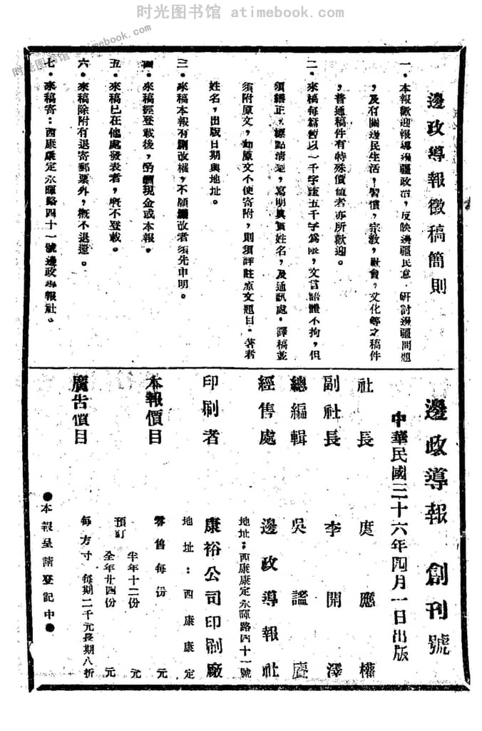 | 网盘路径:/时光图书馆珍藏系列/书籍文件/老报纸/《边政导报》1947-1948年合集.db | ||