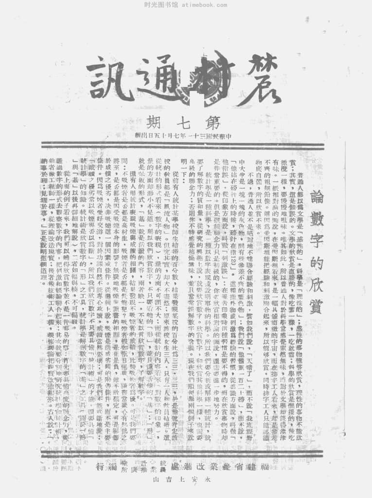 | 网盘路径:/时光图书馆珍藏系列/书籍文件/老杂志、老期刊/民国期刊/福建/《农林通讯》(福建)1942-1943年合集.db | ||