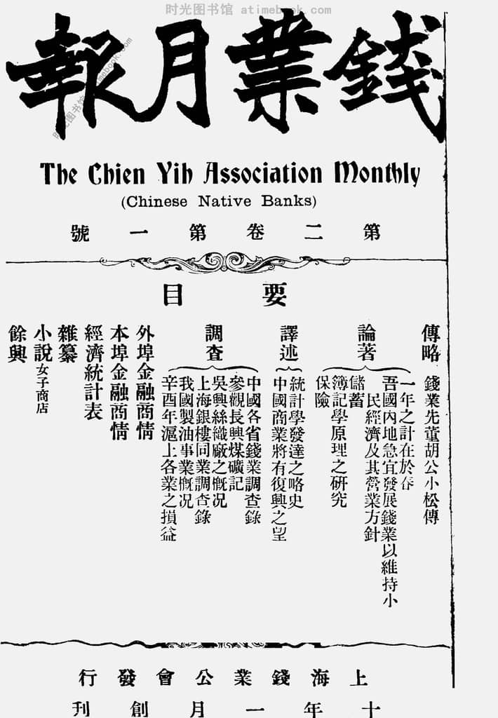 | 网盘路径:/时光图书馆珍藏系列/书籍文件/老杂志、老期刊/《钱业月刊》(上海)1922-1929年合集.db | ||