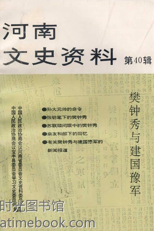 | 网盘路径:/时光图书馆珍藏系列/书籍文件/老图书/《河南文史资料_第40辑_樊钟秀与建国豫军》电子版合集.db | ||