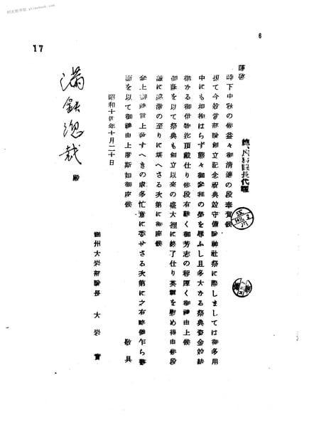 50-49遼阳步兵第五联队长关于捐赠慰问金一事给满铁社长山本条太郎的感谢状一九二八年六月二五日