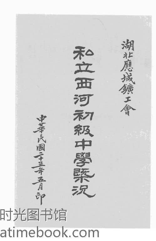 | 网盘路径:/时光图书馆珍藏系列/书籍文件/老图书/《湖北应城矿工会私立西河初级中学概况》电子版合集.db | ||