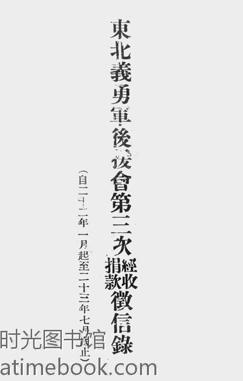 | 网盘路径:/时光图书馆珍藏系列/书籍文件/老图书/《东北义勇军后援会第三次经收捐款征信录(自二十二年一月起至二十三年七月底止)》电子版合集.db | ||