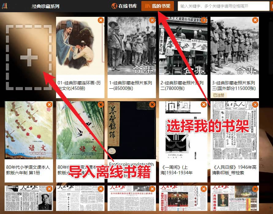 第2步、拖拽下载好的书籍文件到我的书架界面,安卓手机点击书架上十字框导入